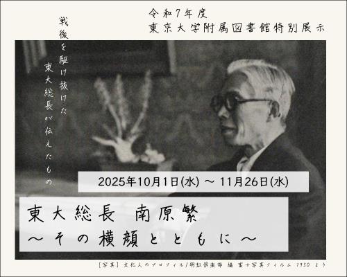 本展示では総合図書館のほか、南原と関わりの深い法学部や教養学部の蔵書に加え、文書館が所蔵する南原家からの寄贈資料などをご紹介します。また「東京(帝国)大学新聞」の記事や、南原が初代会長を務めた東京大学出版会の資料なども取り上げます。さらに、故郷への思いを著した書物や、歌人としての顔も持つ南原の短歌に関する資料にも焦点を当てます。戦後を駆け抜けた東大総長が伝えたものを、ぜひ感じ取ってください。(会期10月1日~11月26日)